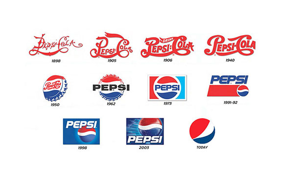 有时人们的视觉心理会追随那些简洁明了且具有一定组织形式及意义的对象,这里我们要举碳酸饮料巨头百事可乐(Pesicola)logo变化的例子。早在1898年百事可乐就诞生了(可口可乐在1886年诞生),同年百事可乐有了自己的logo。字体具有一定的时代气息,1898年到1940年百事可乐的标志改进都是以花体字体的造型出现的。发展到1950年后就出现了正面瓶盖的造型,强化饮料的说明性特征。其中1962年的修正方案中改变花体为等线体是一次较大的突破。