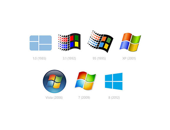 例如美国微软公司,其在1975年成立初期时的操作系统为视窗结构,因此叫做Windows。那时的操作系统标志较为简洁明了,未使用过多的修饰及拟物形态在标志上。随后在1992年的Microsoft Windows 3.1上,我们看到对未来产生深远影响的“微软窗口”,标志包括经典的窗口,经典的四种颜色,经典波浪动态效果。这个标志给后面的Windows logo设计留下了很深远的影响。在随后的一段时间内,我们电脑的开机界面就是这个蓝天白云下的微软Windows。