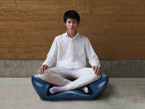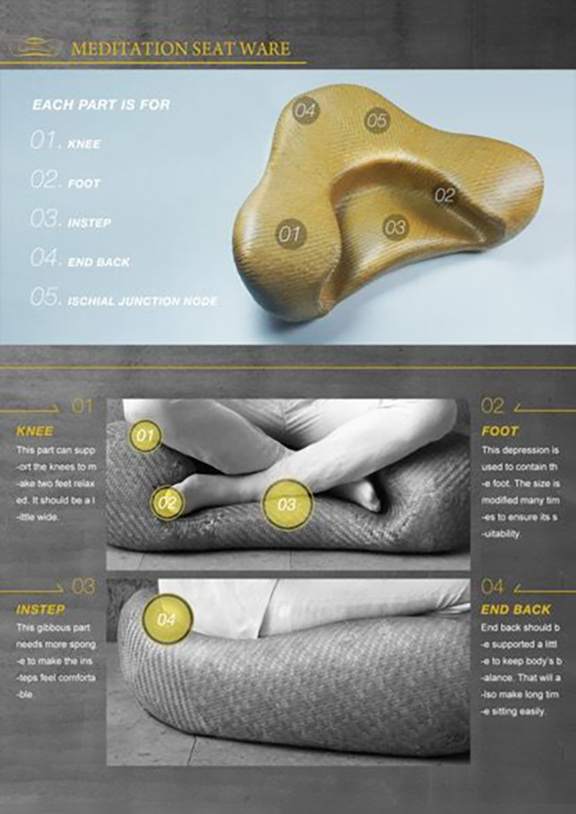 冥想最常见的方式便是盘腿而坐,这样一种坐姿的好处在于能将身体团圆成一个有机整体,且身体的血液集中于人体上半身,使得脏腑与脑部供血充足,便于集中精力,古人常借这种姿势以打坐冥想,思考自然万物存在与关联的哲理。但是这种坐姿久坐容易血液流通不顺畅,导致腿麻而无法继续。设计师高凤麟为了让现代人能够拥有更为舒适的方式进行冥想,“冥想座具”就此诞生。
