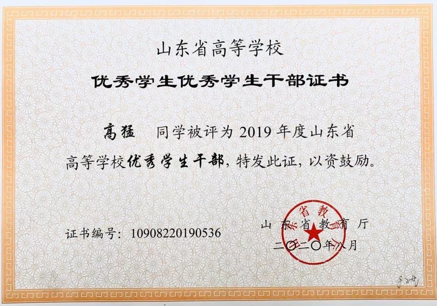 荣获2019山东省优秀学生干部,