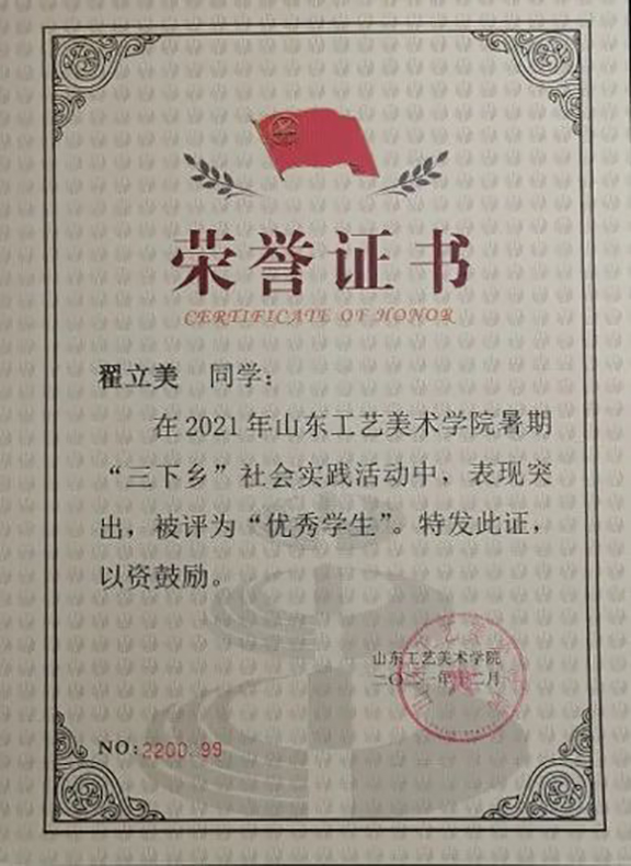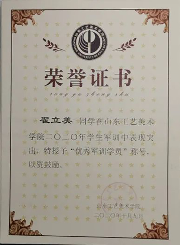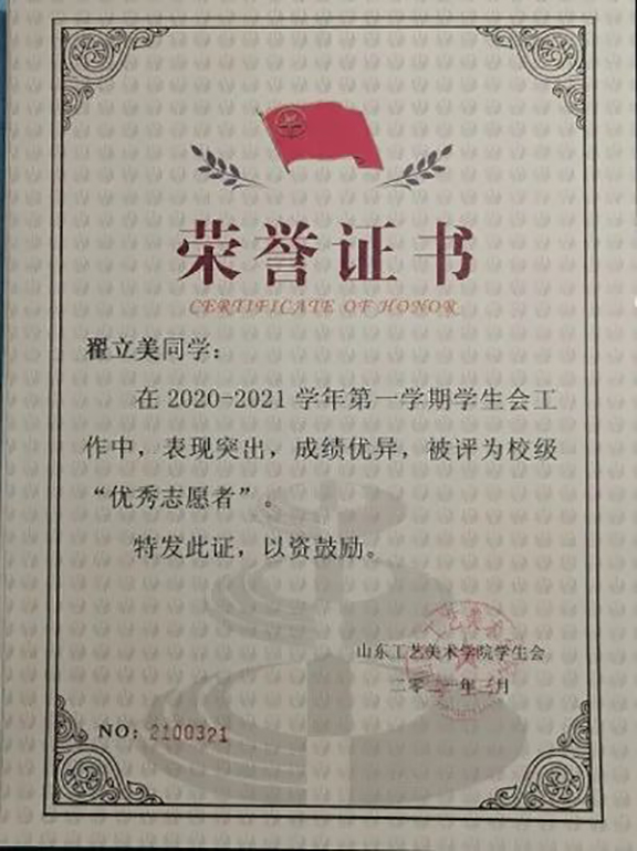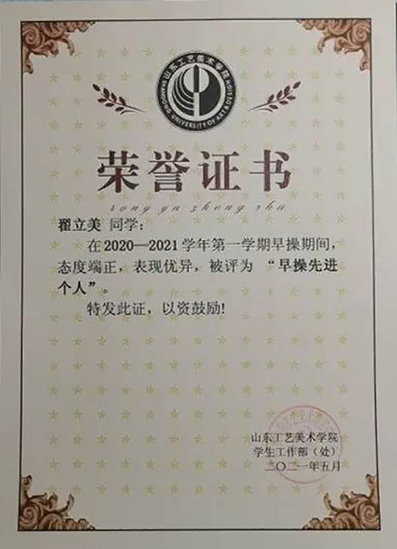 翟立美在学习期间态度端正、目标明确,于2020—2021大一学年成绩优异,以综合第一的成绩荣获校级一等奖学金。