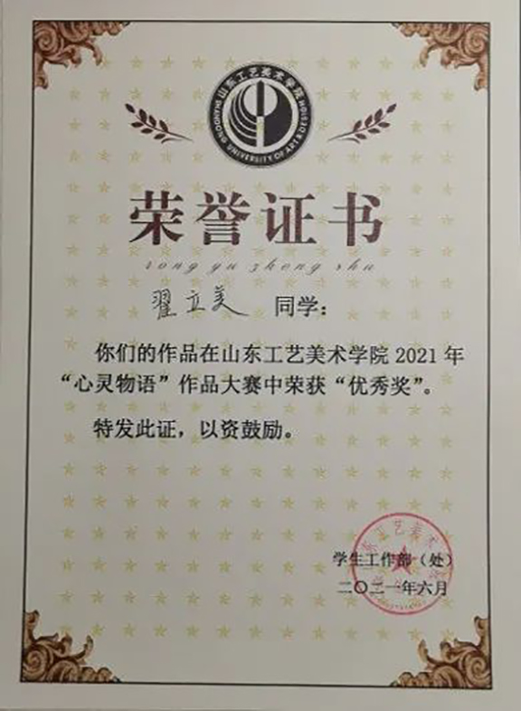 学习方面,翟立美上课认真听讲,积极配合老师,课下独立完成作业,认真对待专业的学习,严格要求自己。她热爱自己的专业,期待灵感迸发的瞬间,更享受设计与制作的过程。
