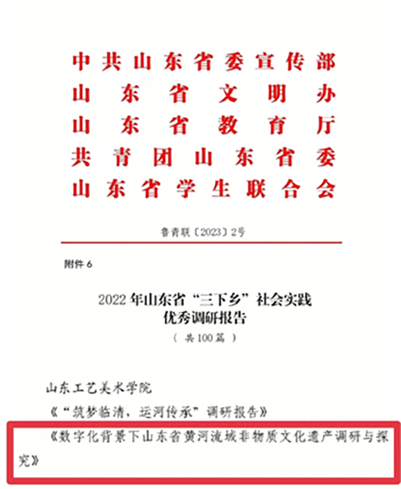 2022年暑假参加“山东省黄河流域非遗文化调研与数字化展示”社会实践活动,调研围绕沿黄九市,实地走访了济南和东营的非物质文化遗产,采取线上线下相结合的方式,感受到了非遗的魅力所在,希望为非遗的传承与发展作出一份贡献。团队所写的调研报告经过多轮对于调研报告的修改,最终荣获了山东省优秀调研报告。