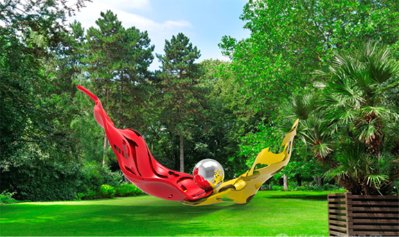 作品参照了珙桐花的样子,珙桐花型独特有两片形状像鸽翼的白色苍片,我选择用红、黄两种颜色,代表新时代青年的活力和积极向上,红色苞片采用了四川脸谱的特色进行镂空,黄色苞片采用圆形镂空,中间的球体用不锈钢的材质倒影让两片苞片交相呼应。希望世界如花语一样和平,各国友好相处。