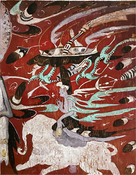 作品是临摹自敦煌莫高窟第431窟,选择这幅作品是因为被红、黑、白三者颜色的交相呼应所深深吸引,画面中人物、事物都以细致的变化,给人一种浪漫主义的感觉,使佛传故事变得更生动、更艺术化,更有神秘感。