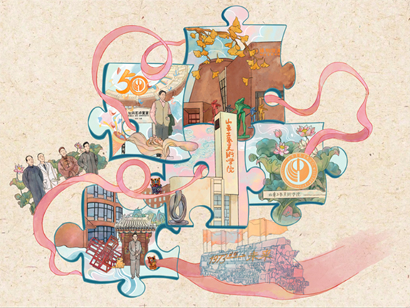 威尼斯7798cc建校50周年的主题,借鉴构图五个拼图的方式展现学校不同的风采,其有代表性的建筑和物品相结合,感受学校50年来的发展历程,火车冲向前方,表达了对于未来更好的美好祝愿