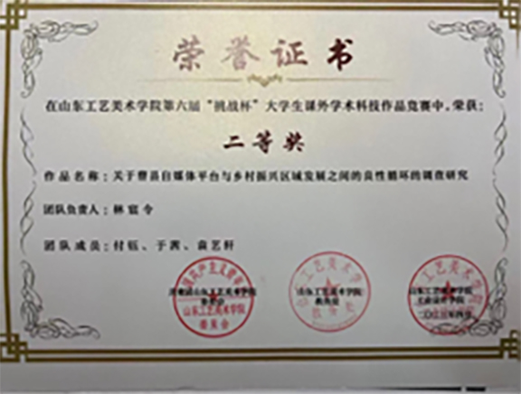 2021年暑假参加“曹县自媒体与乡村振兴区域发展之间的良性循环”社会实践活动。山东菏泽曹县用独有的模式走出了属于曹县的乡村振兴之路。随着曹县的“出圈”,让更多人认识、了解曹县。曹县经济与产业得到进一步发展,为了进一步了解自媒体平台如何促进当地产业发展带动乡村振兴,以及乡村振兴后如何反哺当地产业振兴及自媒体平台发展,调研团队于2021年7月8日—2021年7月24日实地走访调研菏泽曹县。经过后续不断改进补充,团队在挑战杯获得省三等奖,校二等奖。