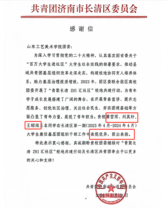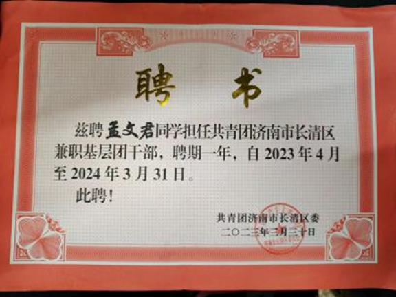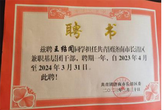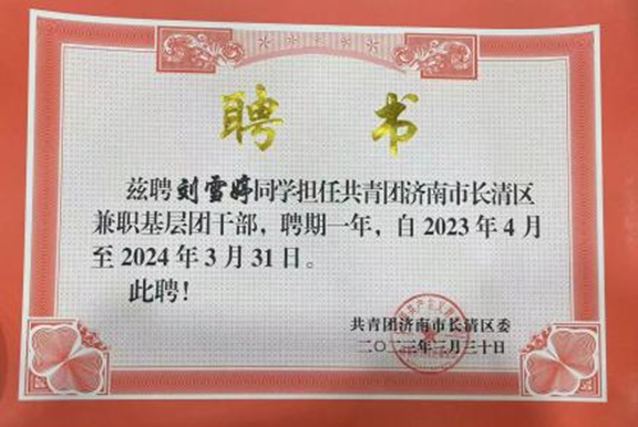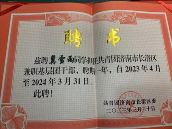2023年,学校团委积极发动组织学生积极参与,共有5名同学成功通过选拔参与到基层团务工作中,兼职工作期满一年,其中冀雪雨、刘昊轩、王绍闻三位同学获得共青团长清区委的表彰。