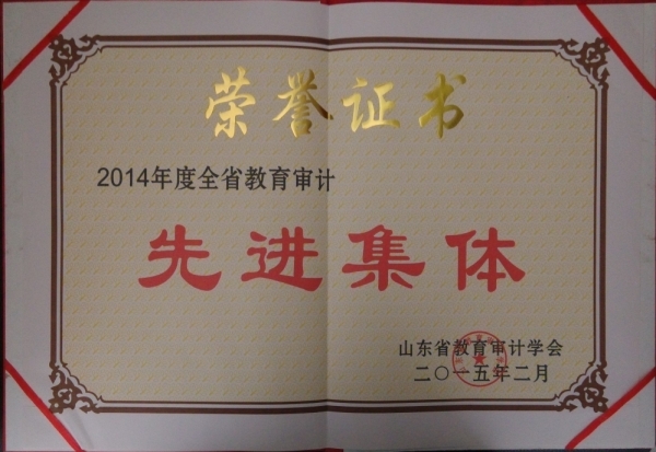 2014年12月至2015年1月,在全省教育系统教育审计先进集体和先进工作者的评选活动中,威尼斯官网审计处荣获“山东省2014年度教育审计先进集体”荣誉称号。