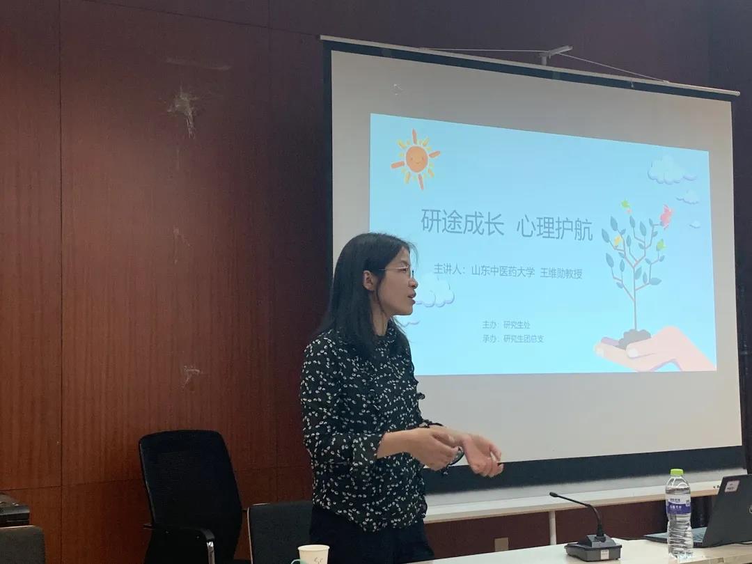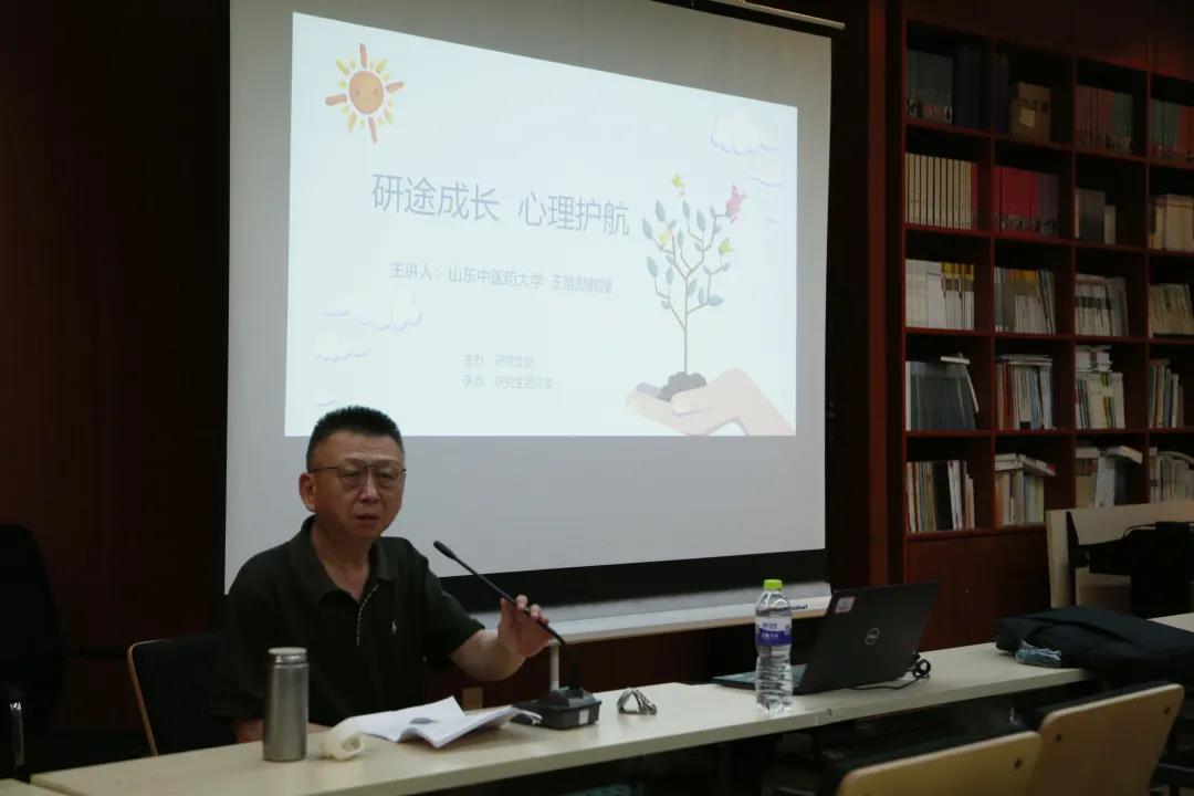为加强研究生心理健康教育,帮助在校研究生正确面对学业科研压力和科学管理情绪,5月26日下午,研究生团总支在研究生活动室举办了“研途成长,心理护航”心理健康讲座。讲座特邀山东中医药大学王维勋教授主讲,研究生处副处长陈慧主持,研究生团总支书记王卫卫、各班心理健康委员、心灵护航员以及部分研究生参加了本次讲座。