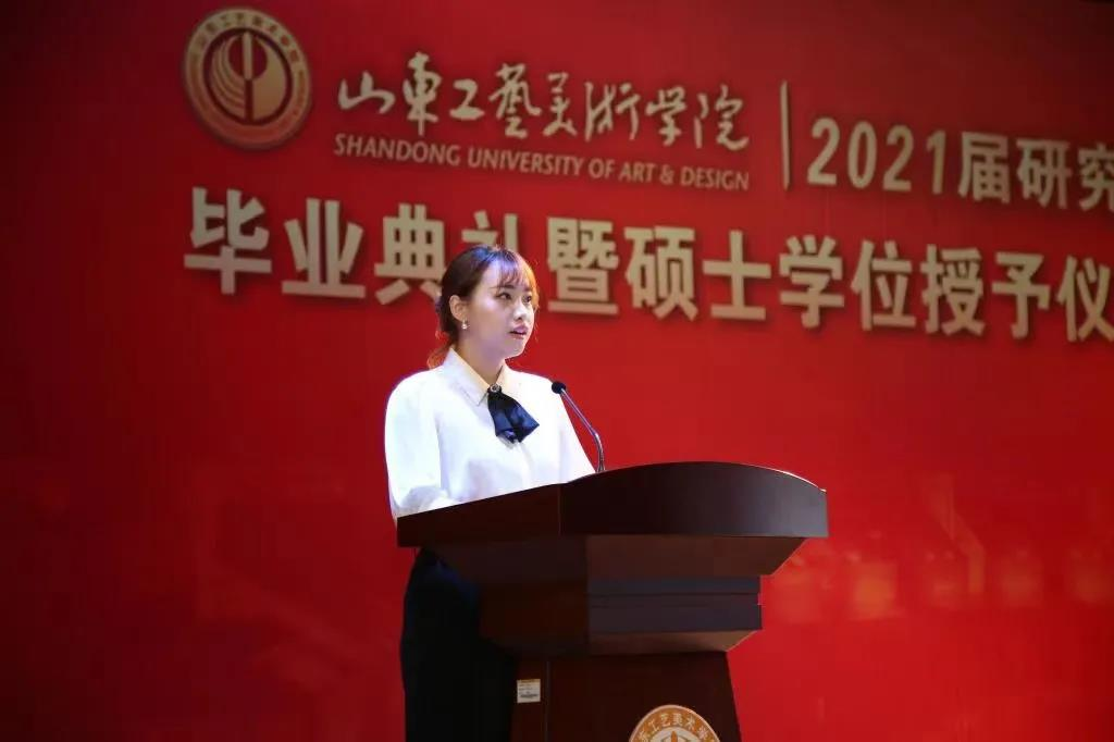 毕业生代表李林代表全体研究生向母校致以最衷心的感谢。她表示,将秉承母校“艺术服务社会”“设计服务民生”“为人民而设计”的情怀和境界,用在母校学到的知识和本领,报效祖国、服务社会,为实现伟大的“中国梦”贡献自己的聪明才智!