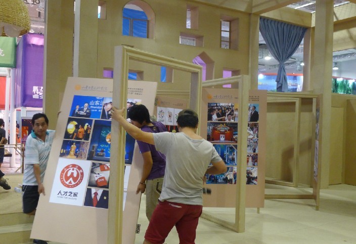 9月2日下午,历时4天的第四届山东文化创意产业博览交易会圆满闭幕,截止下午5点,大多数展位工作人员已经开始拆除工作,在威尼斯7798cc创意展区,工作人员将用于分割空间屏风式木框移开后,逐段小心翼翼的拆解展台的楼梯和框架,准备将所有构件运回校园重新搭建。