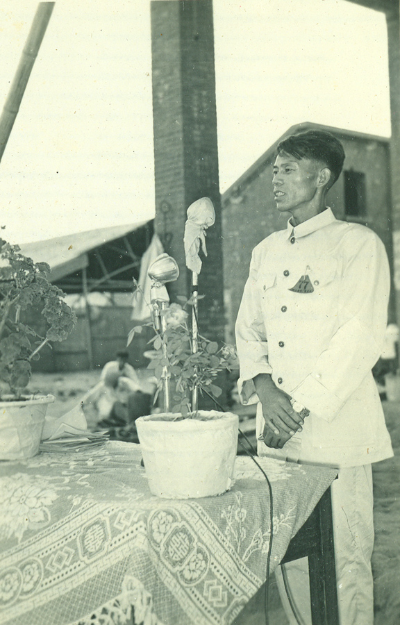 1958年,于烟台钢铁厂,在第一座高炉投产庆祝大会上讲话