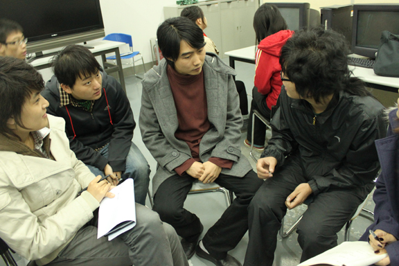 上午各小组重新聚到一起,将前一天想法创意与搜集的资料汇总整合,依据各自的市场目标定位,重新梳理思路,制定出了项目方案的大体流程。自此,工作坊的工作进入“软件设计”阶段。