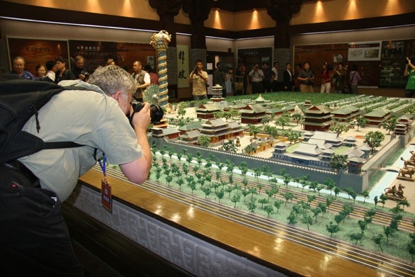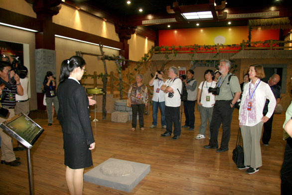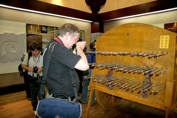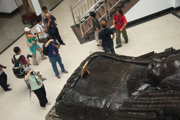 下午采风活动正式开始。摄影大师们来到了墨子纪念馆和墨砚馆。墨子纪念馆外的龙泉塔以及馆内的墨子讲学石雕胸像、《墨子》石刻、名人题词碑刻等成为大师们采风的主要对象;馆内富有中国传统建筑特色的角楼、回廊、目夷亭等现代化与民族形式相结合的园林建筑群体,自然也成为大师们拍摄的对象;“墨子时空观”、“小孔成像”演示厅,中国四大名砚——端砚、洮砚、歙砚、澄泥砚引起了大师们的极大兴趣,不绝于耳的相机快门声反映了大师们对中国传统文化的热爱之情。墨子的科技、军事成果,中国传统军事防御武器云梯、撞车、连弩之车、渠答、火摔、悬脾以及“宋国首都——宋城”等更为吸引大师们的眼球,他们纷纷合影留念,用相机记录下自己的滕州之行。此时的他们已不只是摄影大师,而成为中国传统文化的追随者和传播者,中华民族的传统文化将借助摄影大师们的镜头宏扬至世界各地。