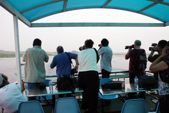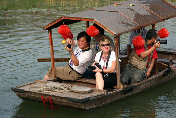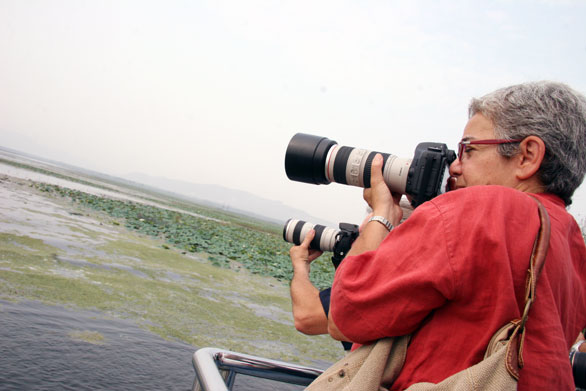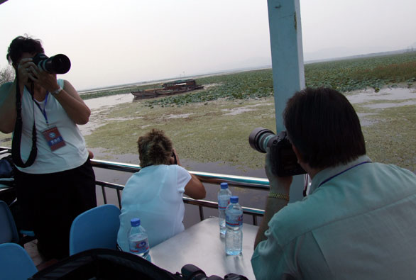 11时,摄影家们又驱车赶到位于滕州西部滨湖镇境内的微山湖湿地红荷风景区。“西边的太阳快要落山了,微山湖上静悄悄,弹起我心爱的土琵琶,唱起那动人的歌谣。”在导游婉转优美的歌声中,摄影家们坐船进入长满芦苇和荷叶的微山湖内,一望无际的碧绿荷叶、茂盛的芦苇、狭长的航道、悠闲自得的的船上人家、忽显忽隐水鸟都成为摄影家们镜头争相关注的焦点。来自美国职业家协会的苏珊兴奋的说:“这里实在太美、太有趣了,我真想把所有东西都拍摄下来带回去。”