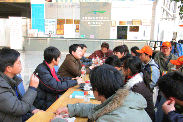 宣传组工作人员热情服务、尽职尽责。2月24日、25日,宣传组赶到舜耕国际会展中心布置会展中心四周宣传展板、架设并调试室外广播设备等。