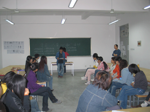 为响应团委号召,正确树立大学生社会主义荣辱观,4月26日晚,服装学院组织2004级、2005级全体同学以团支部为单位在各班教室召开学习“八荣八耻”的团支部会议。