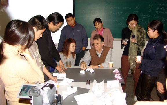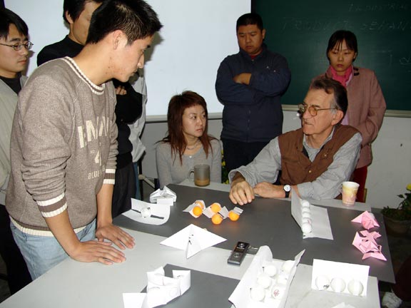 上午晚些时候,雷曼教授为学员布置ExerciseC,这也是本次研修班的最后一次基础练习,这次练习要求学员用一张卡纸、一把美工刀、6个乒乓球设计制作一个6个乒乓球的礼品包装盒,与前两次练习不同,雷曼教授对这次练习没做任何特别要求,学员可以开动脑筋,充分发挥自己的想象力,来完成一个“符合要求”的包装盒设计。