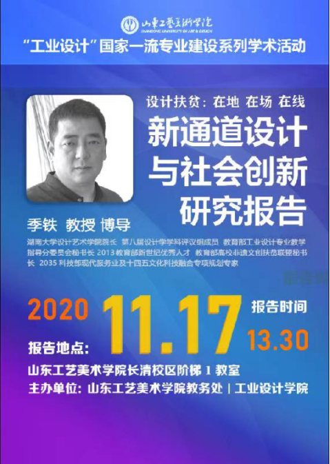主讲人简介:季铁,教授,博士生导师,现任湖南大学设计艺术学院院长、第八届设计学学科评议组成员、教育部工业设计专业教学指导分委员会秘书长、2013教育部新世纪优秀人才、教育部高校非遗文创扶贫联盟秘书长、2035科技部现代服务业及十四五文化科技融合专项规划专家。