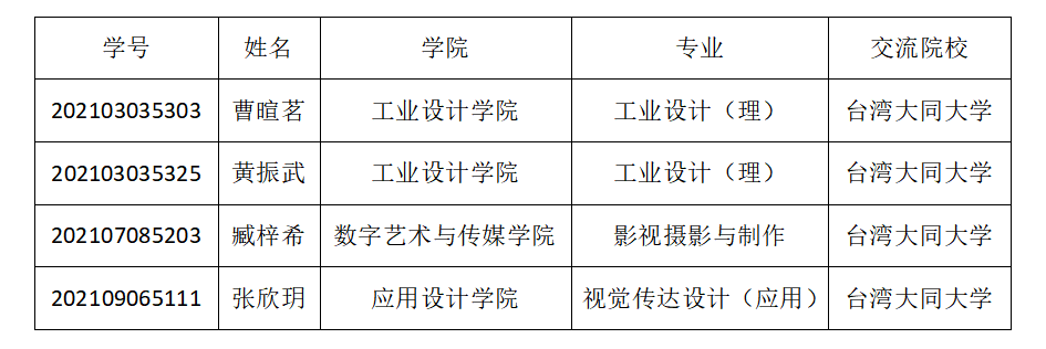 根据《威尼斯7798cc在校生访学、留学管理办法(试行)》规定,按照访学条件对报名学生进行审查,曹暄茗等4名同学符合台湾大同大学访学的条件。为体现公开、公平、公正原则,广泛听取大家意见,现将其公示。如有不同意见,请于2023年4月24日前,以电话、传真、信函等形式向台港澳事务办公室、教务处办公室反映。