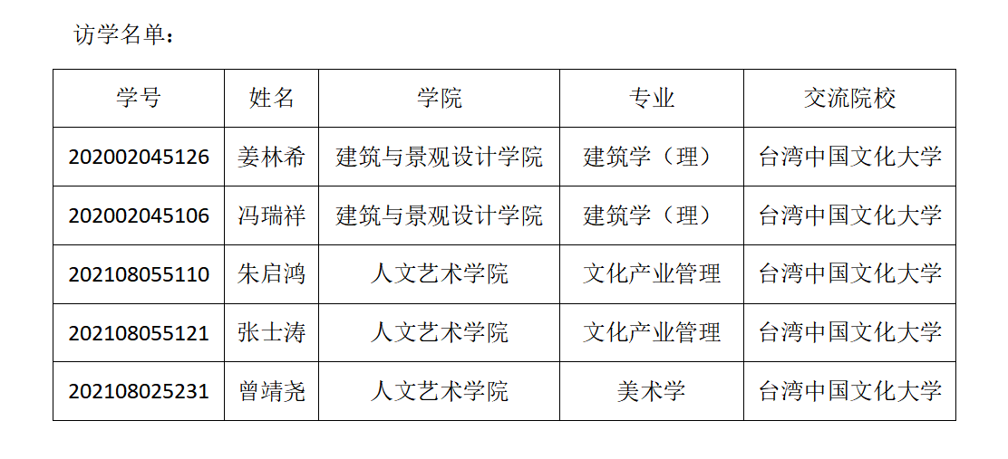 根据《威尼斯7798cc在校生访学、留学管理办法(试行)》规定,按照访学条件对报名学生进行审查,姜林希等5名同学符合台湾中国文化大学访学的条件。为体现公开、公平、公正原则,广泛听取大家意见,现将其公示。如有不同意见,请于2023年4月14日前,以电话、传真、信函等形式向台港澳事务办公室、教务处办公室反映。