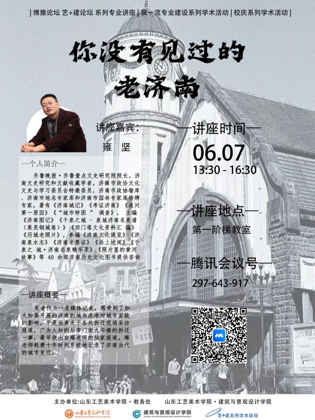 嘉宾简介:雍坚, 齐鲁晚报·齐鲁壹点文史研究院院长,济南文史研究和文献收藏学者,济南市政协文化文史与学习委员会特邀委员,济南市政协智库、济南市地名专家库和济南市园林专家库特聘专家,著有《济南城记》《考证济南》《追问第一原因》《“城市特困 ” 调查》, 主编 《济南图记》《千泉之城 - 泉城济南名泉谱(莱芜钢城卷)》《四门塔文化资料汇 编》《历城老照片》,参编《济南文化通览》《济南泉水志》《济南老票证》《泺上述闻》《千泉之 城·济南名泉精华录》《照片里的黄河故事》等 40 余部济南历史文化图书。