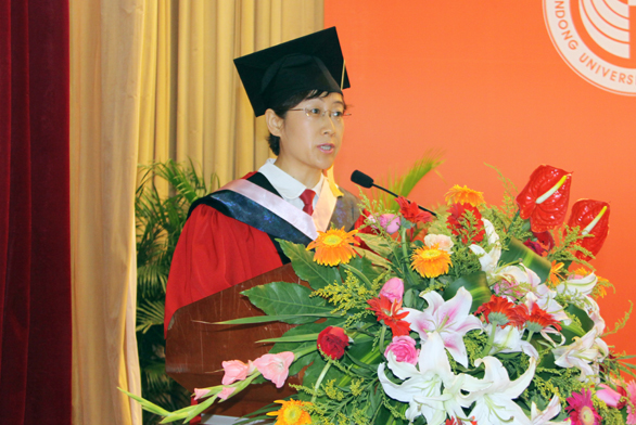 毕业研究生代表徐园园发言,她首先代表全体毕业研究生对学校领导、导师、工作人员的关怀和教导表示衷心的感谢和敬意。徐园园表示研究生学习阶段赋予了他们每个人智慧、理性和成熟,他们为这三年知识的积累、毅力的锻炼而感到自豪,更为明天的拼搏、事业的成功而充满自信与希望,今天不仅是庆贺毕业,更是新征程的开始,毕业研究生们将牢记“天工开物 匠心独运”的校训,努力学习,勤奋工作,让母校为毕业研究生们将来的杰出表现骄傲。
