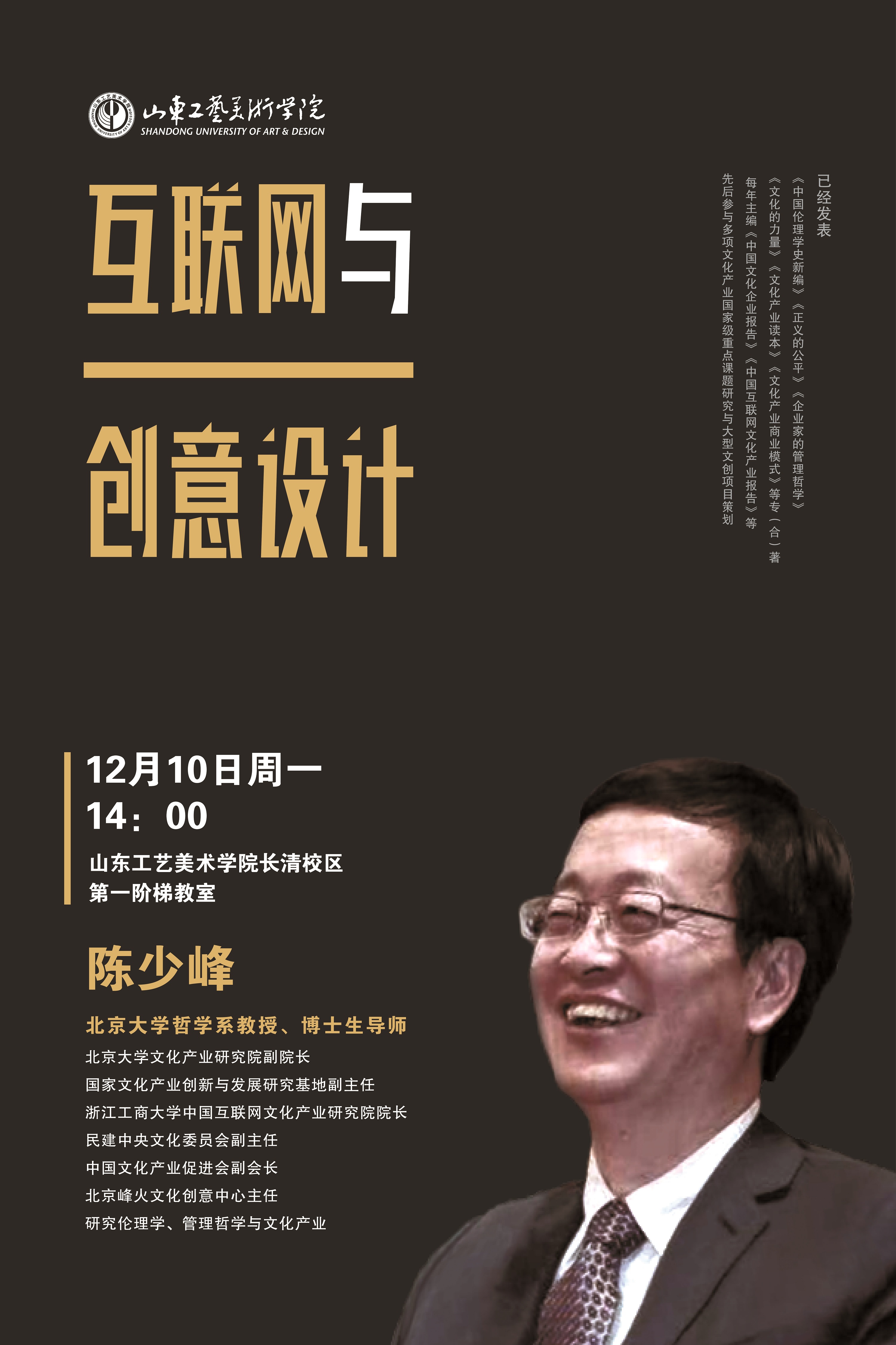 陈少峰,福建漳浦人,北京大学哲学系教授、博士生导师,北京大学文化产业研究院副院长,国家文化产业创新与发展研究基地副主任,浙江工商大学中国互联网文化产业研究院院长,民建中央文化委员会副主任,中国文化产业促进会副会长,北京峰火文化创意中心主任;研究伦理学、管理哲学与文化产业;已经发表《中国伦理学史新编》、《正义的公平》、《企业家的管理哲学》、《文化的力量》、《文化产业读本》、《文化产业商业模式》等专(合)著,每年主编《中国文化企业报告》、《中国互联网文化产业报告》等;先后参与多项文化产业国家级重点课题研究与大型文创项目策划。