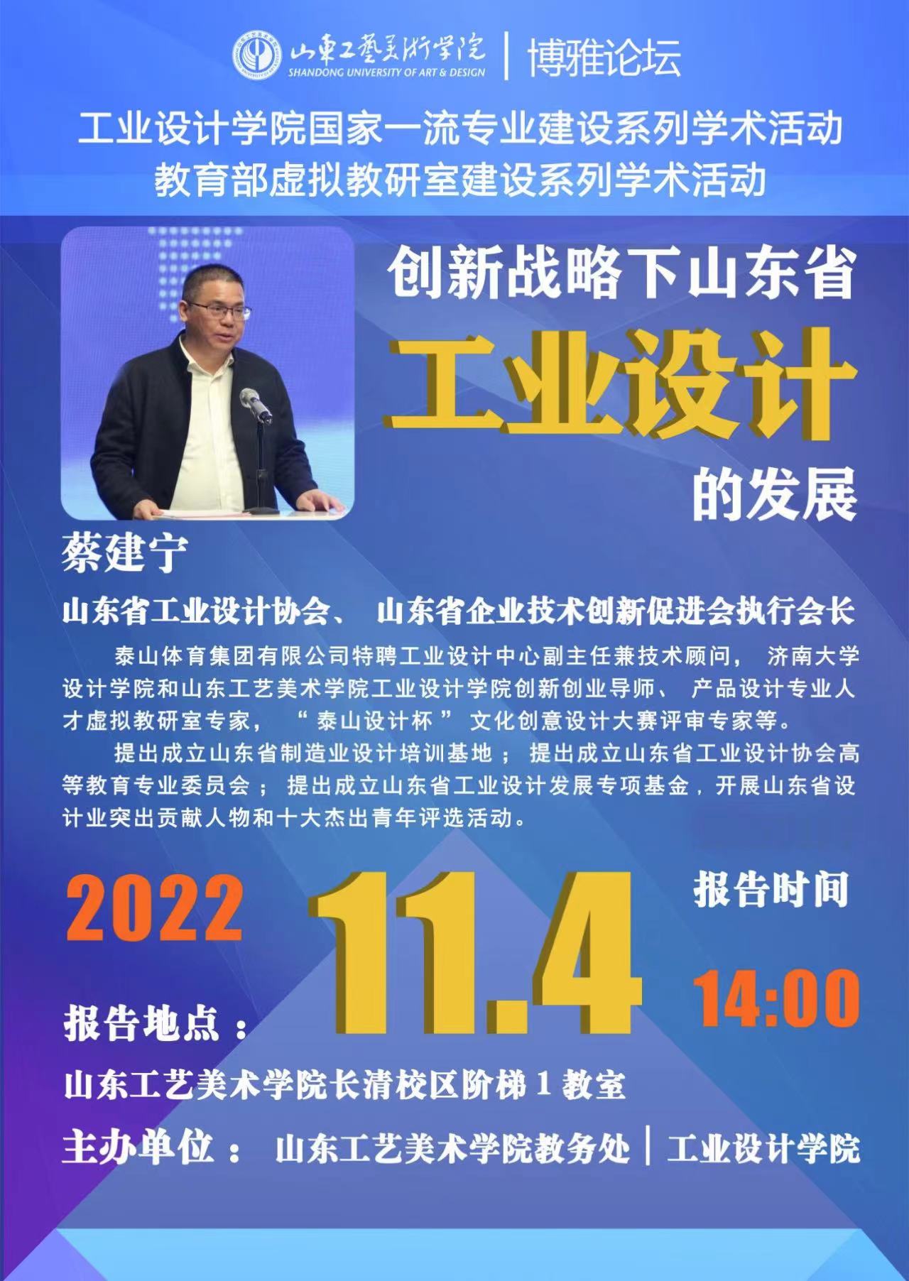 讲座预告:创新战略下山东省工业设计的发展 — 工业设计学院国家一流专业建设系列学术活动 教育部虚拟教研室建设系列学术活动