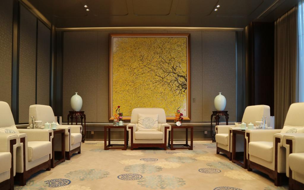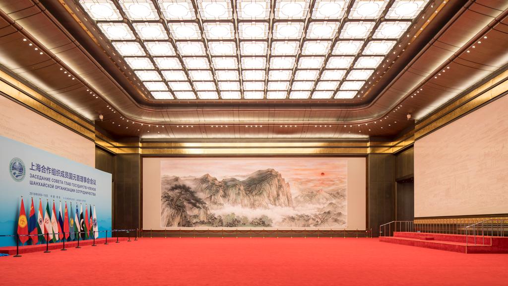 “世界水准、中国气派、山东风格、 青岛特色”是本届峰会主会场、宴会厅 艺术品与陈设相关工作的指导思想,“展 示礼乐文化,体现大国外交风范”是艺术 品与陈设配饰的核心理念。根据峰会的功 能,又将主会场、宴会厅整合分为三大区 块,艺术品与陈设的配饰与各区块对应, 设定分区主题:迎宾区——礼,礼遇贤者, 登泰山而览群岳;会议区——和,和谐 共处,志向同而大道合;宴会区——乐, 乐合天地,百花开而世繁荣。