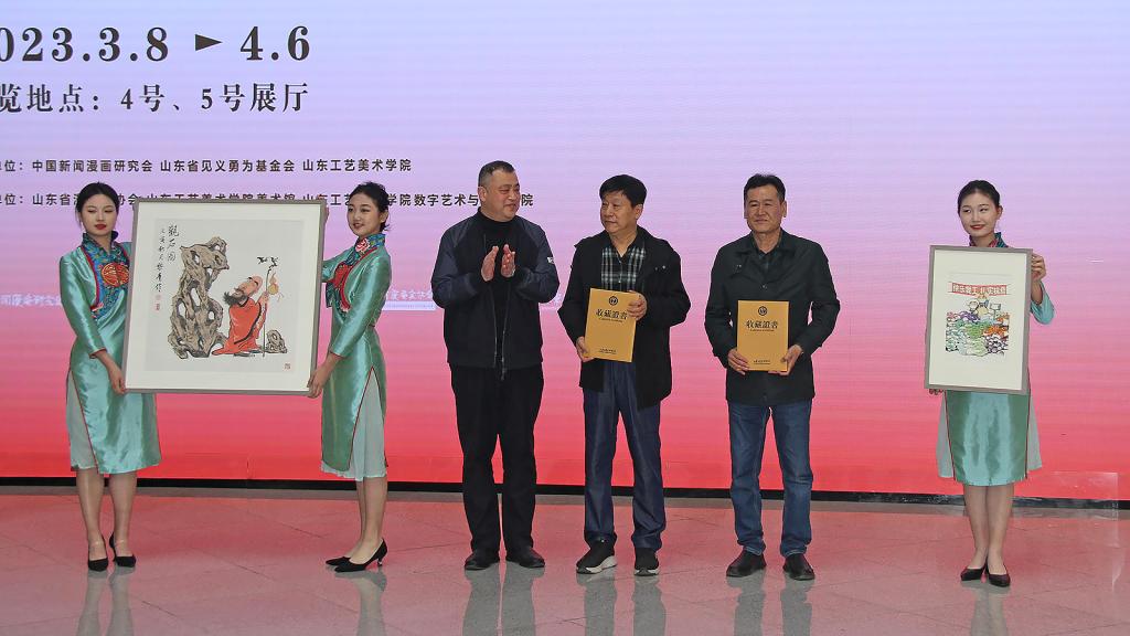 随后,中国美术家协会漫画艺委会主任、山东省漫画家协会主席陈黎青捐赠作品《观石图》,卢洪祥教授捐赠作品《我们是社区的“小后方”》,肖文津老师捐赠作品《利剑出鞘斩妖魔》,宋晓军老师捐赠作品《全球总动员》。党委委员、统战部部长孙大刚教授,党委委员、宣传部部长韩文涛教授分别向捐赠者颁发了收藏证书。