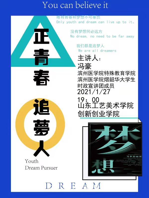 1月27日晚七点,创新创业学院(淄博陶瓷学院)学生思想教育系列主题活动“寒假杂谈”之二——“正青春 追梦人”如期举行。本次活动邀请到滨州医学院特殊教育学院一名视障大一学生冯豪同学与学生进行交流互动。本次活动由团总支书记杨友森主持,党总支副书记林波参加活动。