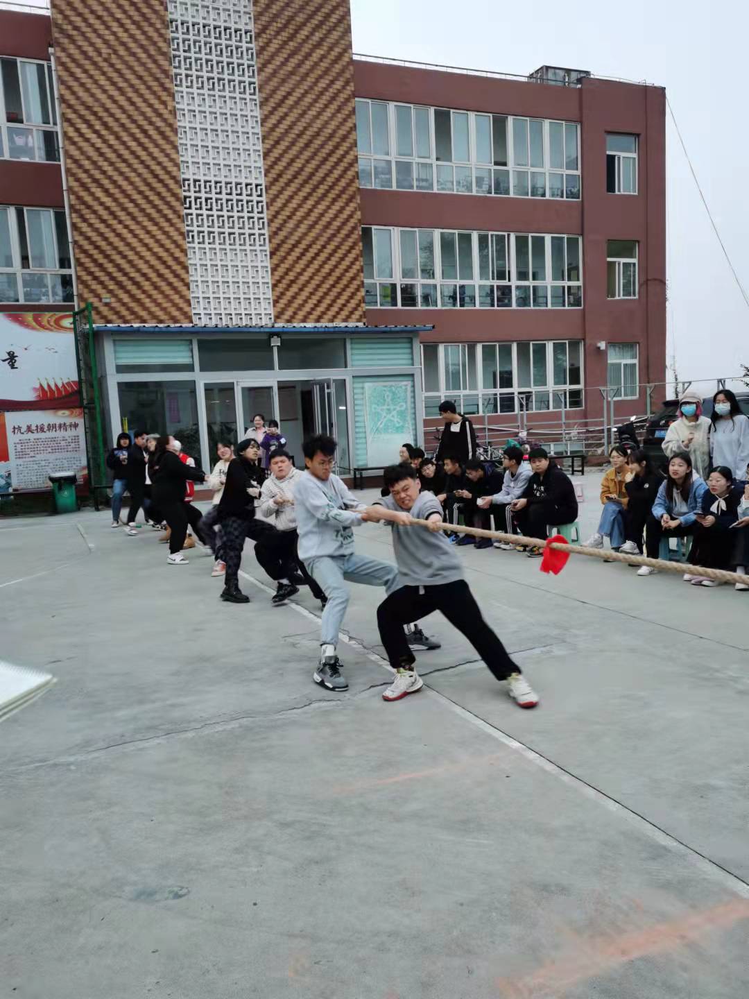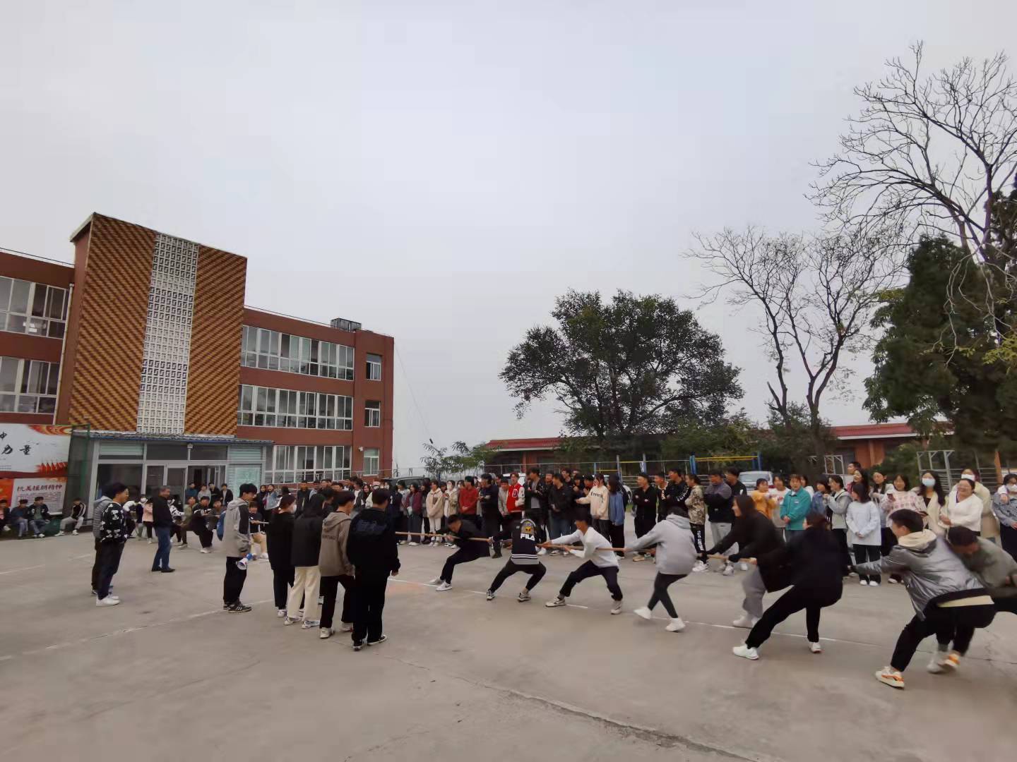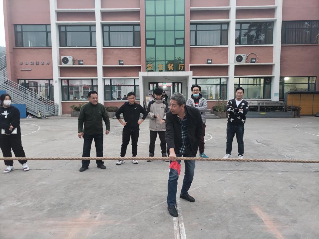 10月26日下午,拔河比赛也如期在操场举行。尽管天气有些寒冷,但赛场氛围十分热烈。比赛规则为每班派出七男三女混搭,最后绳子倾向哪边哪边就获胜。当比赛开始的哨声响起,队友们全都紧握绳子,憋足了劲把绳子往后拉。同学们在旁边则为自己的班级加油呐喊助威。现场既激烈又温馨。最终2020级环境艺术设计三队获得冠军。