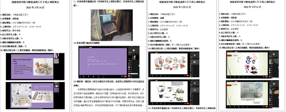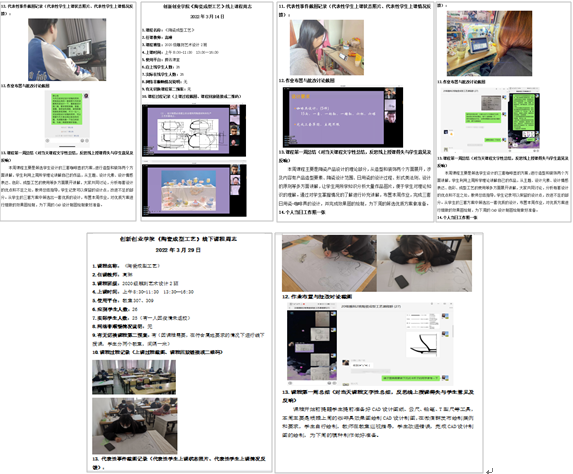 教学形式的转变并没有影响到教师和学生上课的热情,各任课教师根据教学内容和学生实际情况,从课程过程、代表性事件截图、作业布置与批改讨论截图、课程总结与反思等方面都进行了详细地记录,为后期教学改进留下丰富的资料。毛晓帅老师的《室内设计专题1》课程,分十一个章节授课,包括《室内设计概论》、《室内界面处理》、《室内设计审美形式法则》、《室内分类设计》等内容。平时让学生以小组合作的方式,完成作业,引导学生互相评价,取长补短,最后老师总结点评,既活跃了课堂气氛,又增强互动性。
