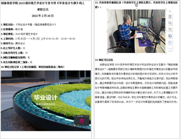 自开学以来,创新创业学院提前谋划,制定了疫情发生情况下的线上教学预案。3月12日,学院按照驻地教育主管部门安排转入线上教学。首批线上课程共开设5门、7个班次,分别为20级环境艺术设计《室内设计专题1》、20级雕刻艺术设计《陶瓷成型工艺》、19级视觉传播与设计制作《毕业设计》、19级环境艺术设计《毕业设计》和19级雕刻艺术设计《毕业专题设计》,参与线上教学任课教师7人,学生193人。