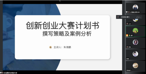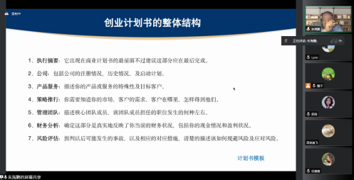 讲座中,朱海鹏结合自己的创业经历和评审经验,给大家详细讲解了计划书的撰写要求、要点和注意事项等方面的内容。一是介绍了创业计划书的作用,能够帮助创业者自我评价、理清思路,凝聚人心、有效管理,对外宣传、获得融资。二是介绍了创业计划书的整体结构,包括执行摘要、项目背景、产品服务、营销策略、管理团队、财务分析、风险评估几个方面,并通过展示计划书模板,使同学们对计划书有了更直观了解。三是具体分析了创业计划书每部分内容,重点阐述了项目摘要、产品或服务、竞争优势、市场营销、管理团队、财务状况、融资需求等内容。四是呈现优秀获奖计划书,让同学们更细致地了解优秀计划书的细节内容和突出特点,帮助同学们更有针对性地准备创业计划书。