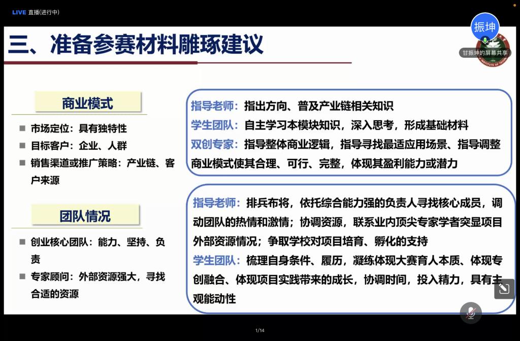 5月15日晚,教务处、学生处、团委、创新创业学院联合组织的创新创业教育系列讲座之五《把握关键要素,提升参赛材料竞争力》以线上方式举办。讲座由北京理工大学团委副书记、人社部“青年就业创业指导专家”甘振坤主讲,学校师生共同观看讲座。