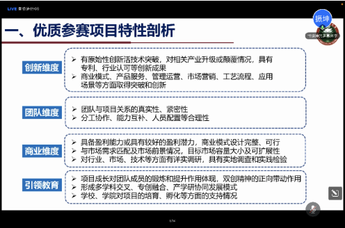 从组织和评审角度分享了三个方面的内容。一是优质参赛项目特性剖析。他从选题立意,行业痛点分析、产品的成熟度、方案的创新性、团队的整体性互补性、商业模式的完整度、项目发展的可行性等八个点一一举例,深入剖析。二是创意阶段项目普遍问题。他从在校生参赛项目角度分析存在的十个普遍问题、六个不够、三个忽视。十个普遍问题包括学生缺少全面参与度、缺少深入调研、对细分领域问题找不准、创新点分量不突出等;六个不够包括团队组建高度互补不够、行业调研问题了解不够、创业模拟要素掌握不够训练打磨修改次数不够等;三个忽视即忽视头部(明确对手)、忽视尾部(与客户的明确接触)、忽视中间(详细可执行的计划)。三是准备参赛材料雕琢建议。他详细讲解了主题鲜明、定位精准、前景广阔、核心突出、背书证明、成员突出等好项目PPT应该具备的九个要素,并重点介绍了做好PPT的四个核心要素。