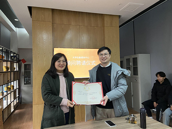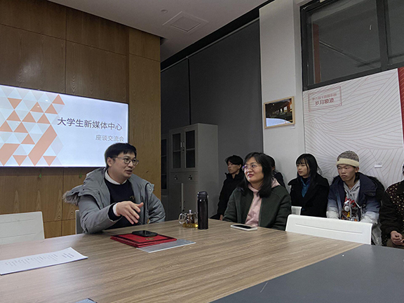 为进一步促进大学生新媒体中心业务提升,2020年12月4日,大学生新媒体中心顾问聘请仪式暨座谈交流会在社联活动室如期举行。半岛传媒集团新媒体创意及短视频矩阵建设中心主任李光鹏、校团委书记邹晓红以及新媒体中心骨干成员参加,会议由团委组织宣传部部部长王伟杰主持。