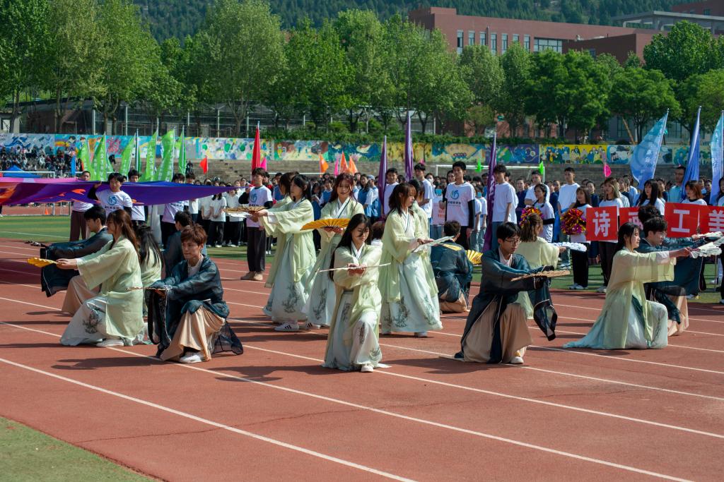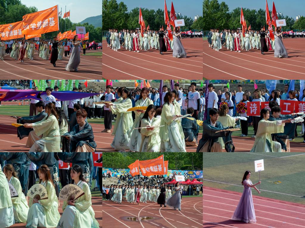 基础教学部的运动健儿们步伐整齐、口号响亮,意气风发的精神面貌展示出新时代学子们的青春风采。他们身着汉服,以独特的舞姿、优美的动作,展现了中华传统文化的魅力,演绎了一场古色古香的精彩表演,为建校50周年献礼,赢得观众阵阵掌声。伴随着巨幅国旗和献礼50周年校庆旗帜的徐徐展开,展现出美丽的画卷,场上再次响起了热烈的掌声。