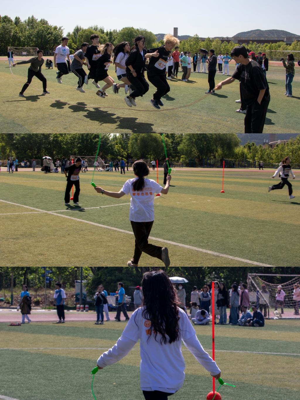赛场上师生团结协作、挥洒汗水;赛场下同学们摇旗呐喊,加油鼓劲,体现团队精神。