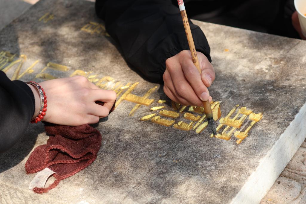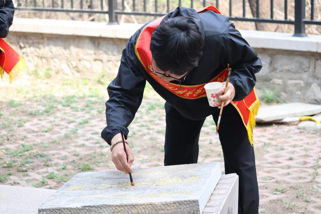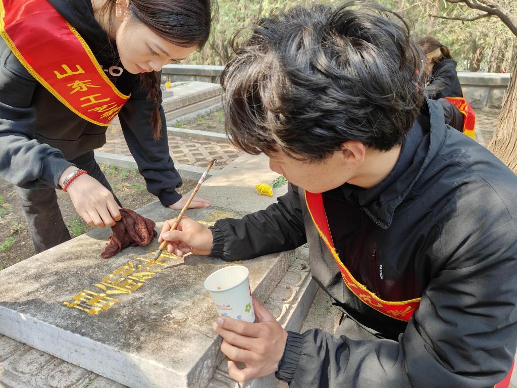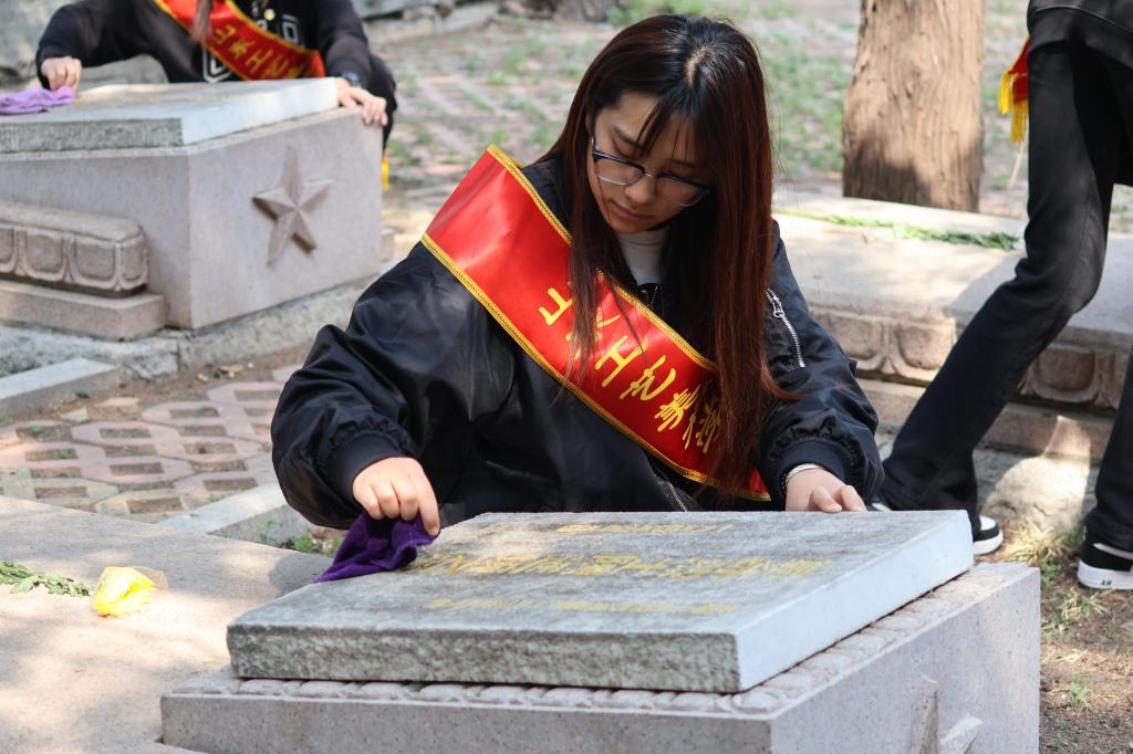 青年团员们满怀敬仰与感激的心情来到烈士墓碑前,墓碑上的每一个字都经过精心雕琢,仿佛在诉说着逝者一生的故事。它们静静地矗立在那里,见证着岁月的流转,成为永恒的记忆。同学们细心地为烈士墓碑擦拭尘土、描绘金色铭文,每一次轻柔的擦拭、每一笔精确的描金,都使同学们深切地感受到了烈士们英勇牺牲的崇高精神。