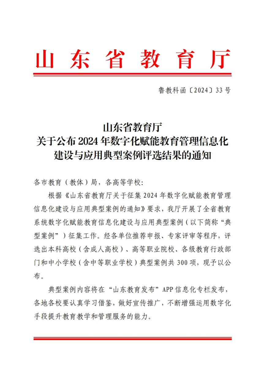 7月27日,山东省教育厅发布《关于公布2024年数字化赋能教育管理信息化建设与应用典型案例评选结果的通知》(鲁教科函〔2024〕33号),威尼斯官网组织报送的2项案例全部入选。